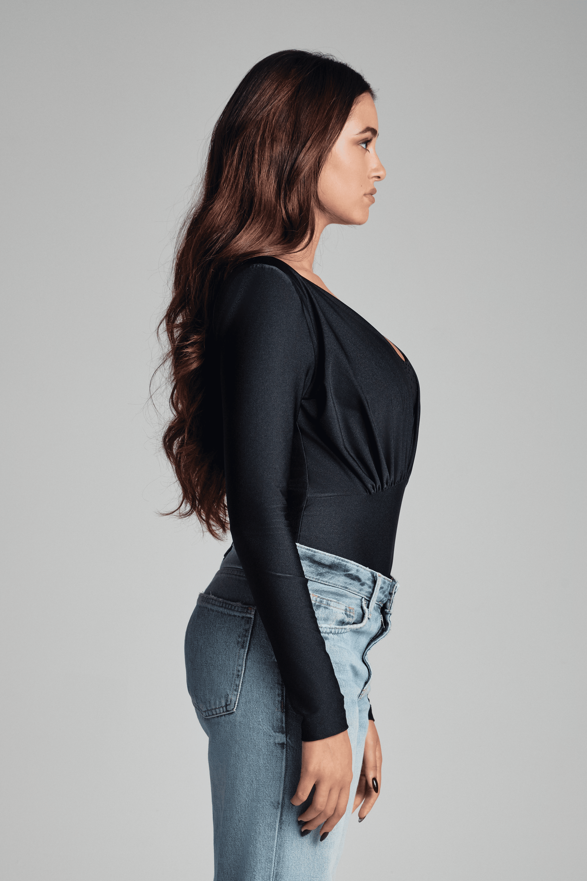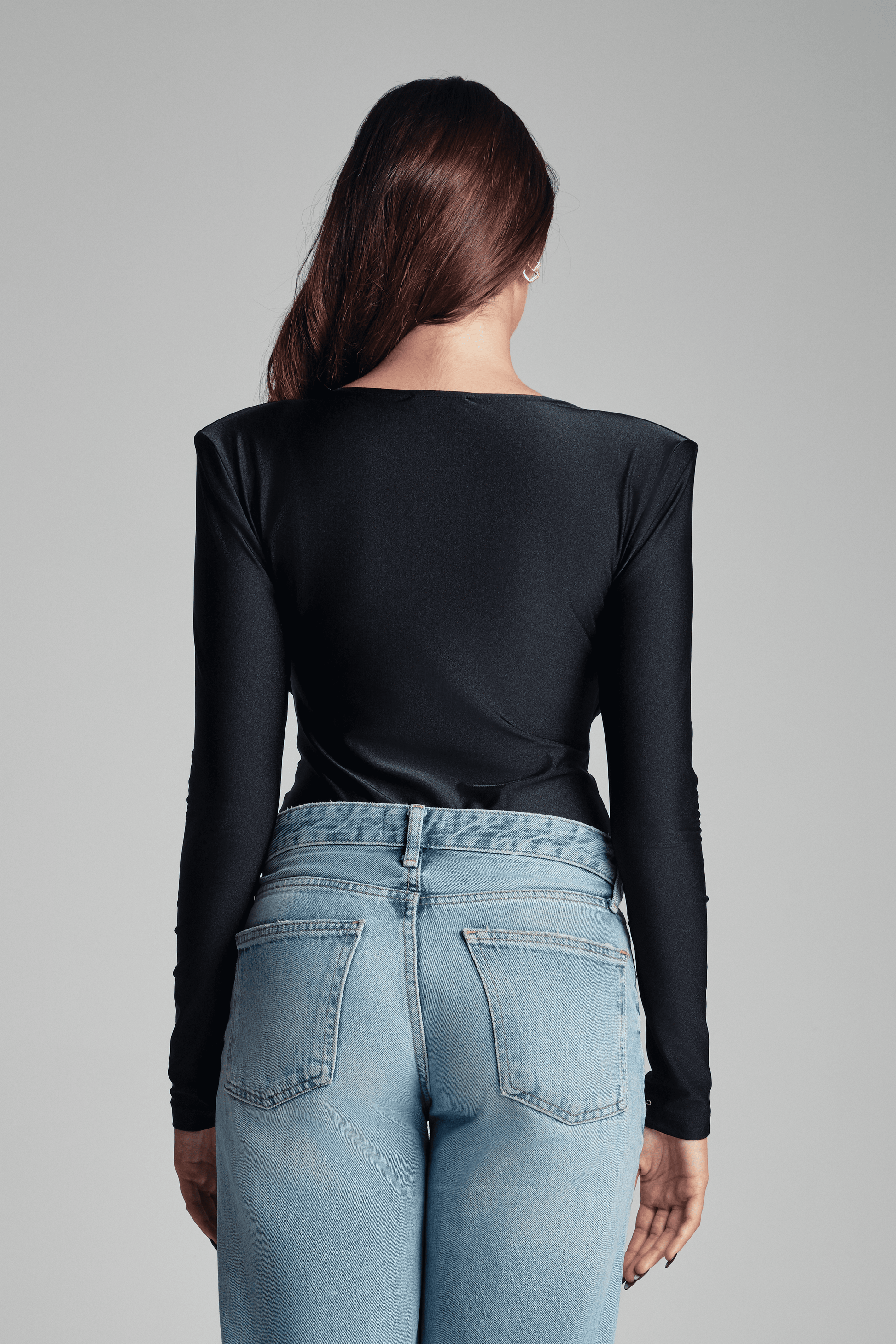 Maniche lunghe e scollatura frontale pronunciata definiscono un capo dal carattere deciso. Le spalline imbottite garantiscono sostegno ed eleganza.Un design raffinato pensato per accompagnarti nei momenti più importanti.